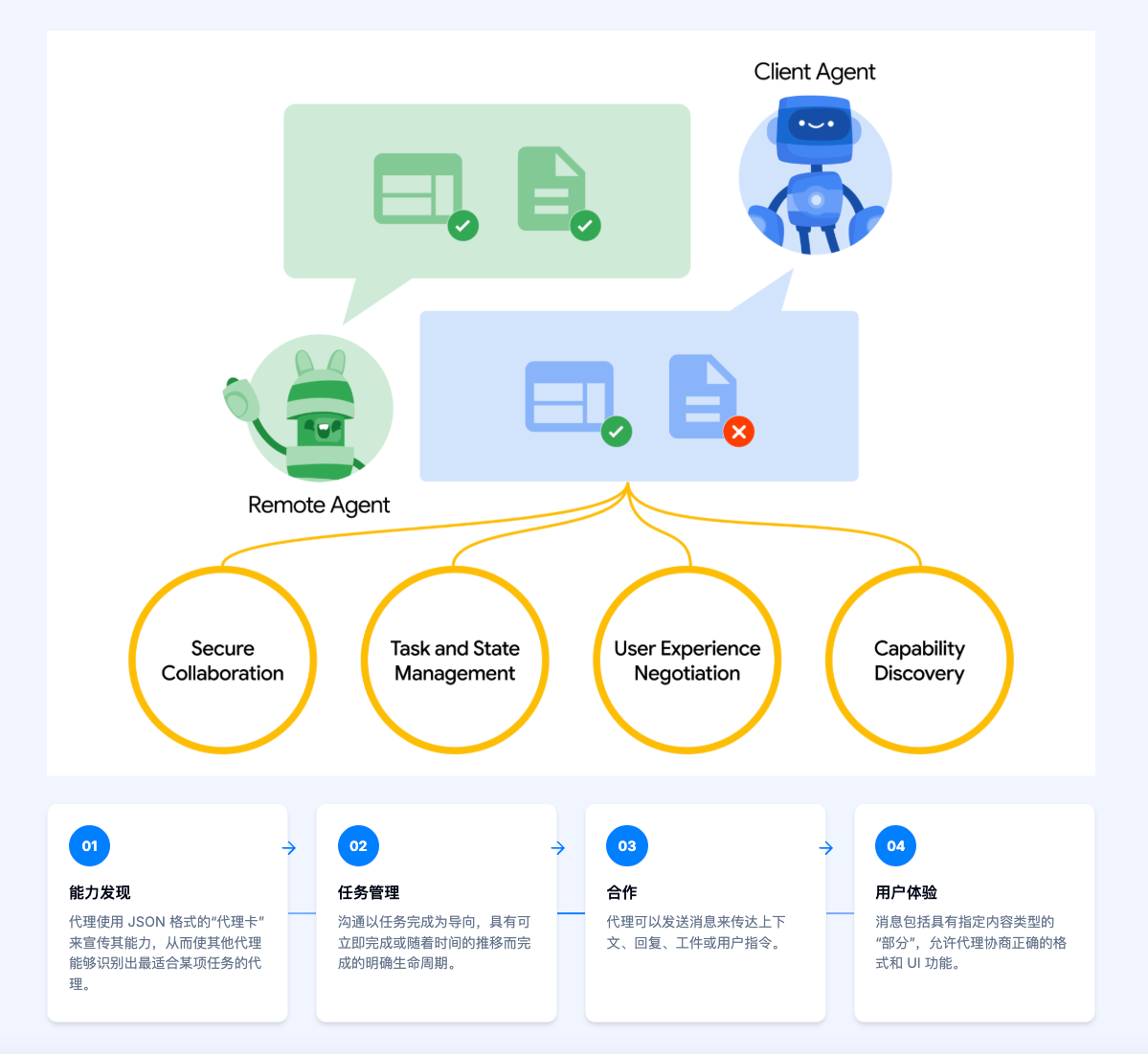 ·Agent Card::描述Agent能力、技能、URL 和认证要求的公共元数据文件(通常位于 /.well-known/agent.json )。客户端使用该文件和Agent进行连接。