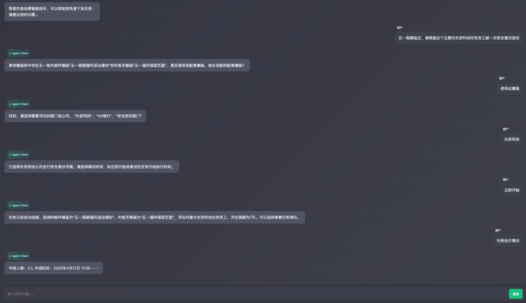 在BAS中,以钓鱼邮件场景为例,假设在BAS界面中存在一个Agent Client,类似一个网页AI助手,当我们向其输入需求: