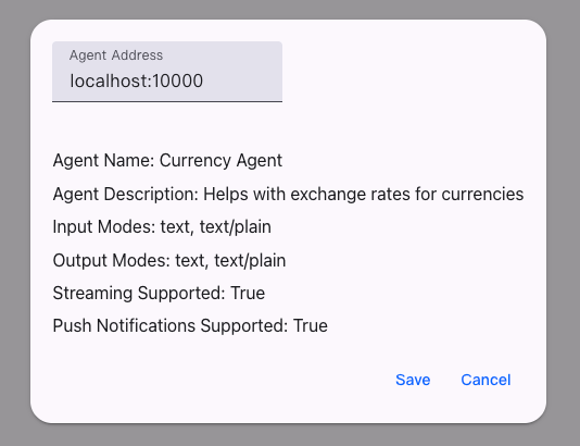 通过本地部署官方A2A样例,使用Google的Gemini模型进行测试。样例中给出了两个Agent,Currency Agent和Image Generator Agent一个是用于汇率转换,一个是用来文生图。