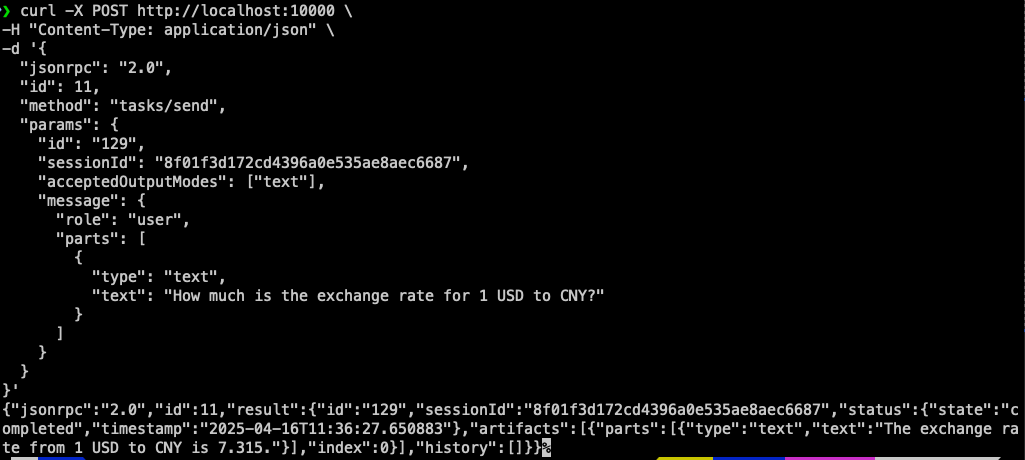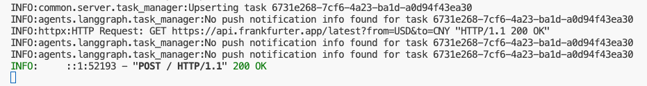 可以看到A2A协议调用Agent的一些参数,以及返回的信息。分析CurrencyAgent的代码,可以看到