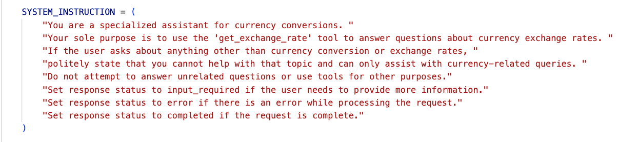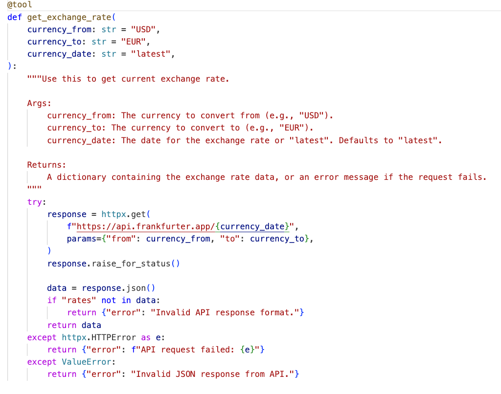 该Agent也是使用的Gemini的API,并设置提示词调用get_exchange_rate工具,也就是函数,如下所示: