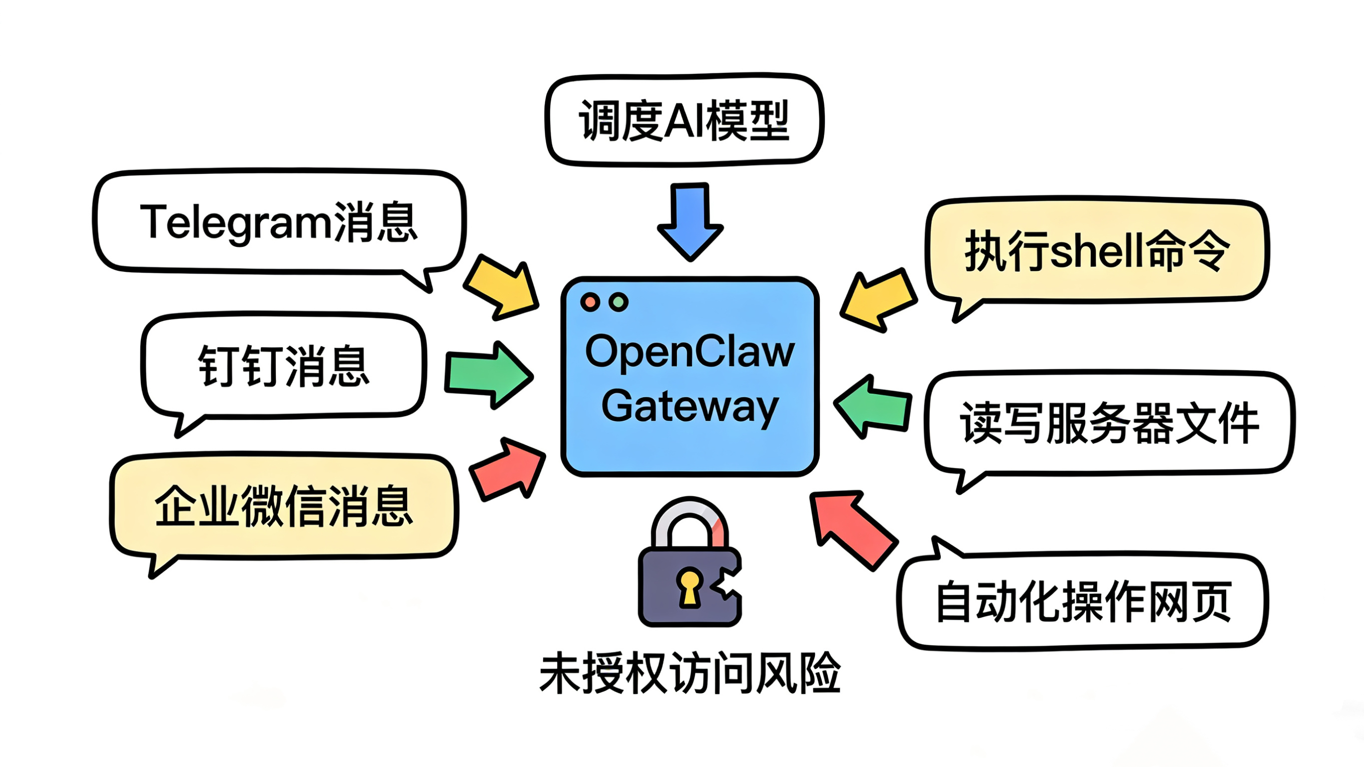 ⼀旦⽹关被未授权访问,攻击者等于接管了这个AI能做的⼀切。