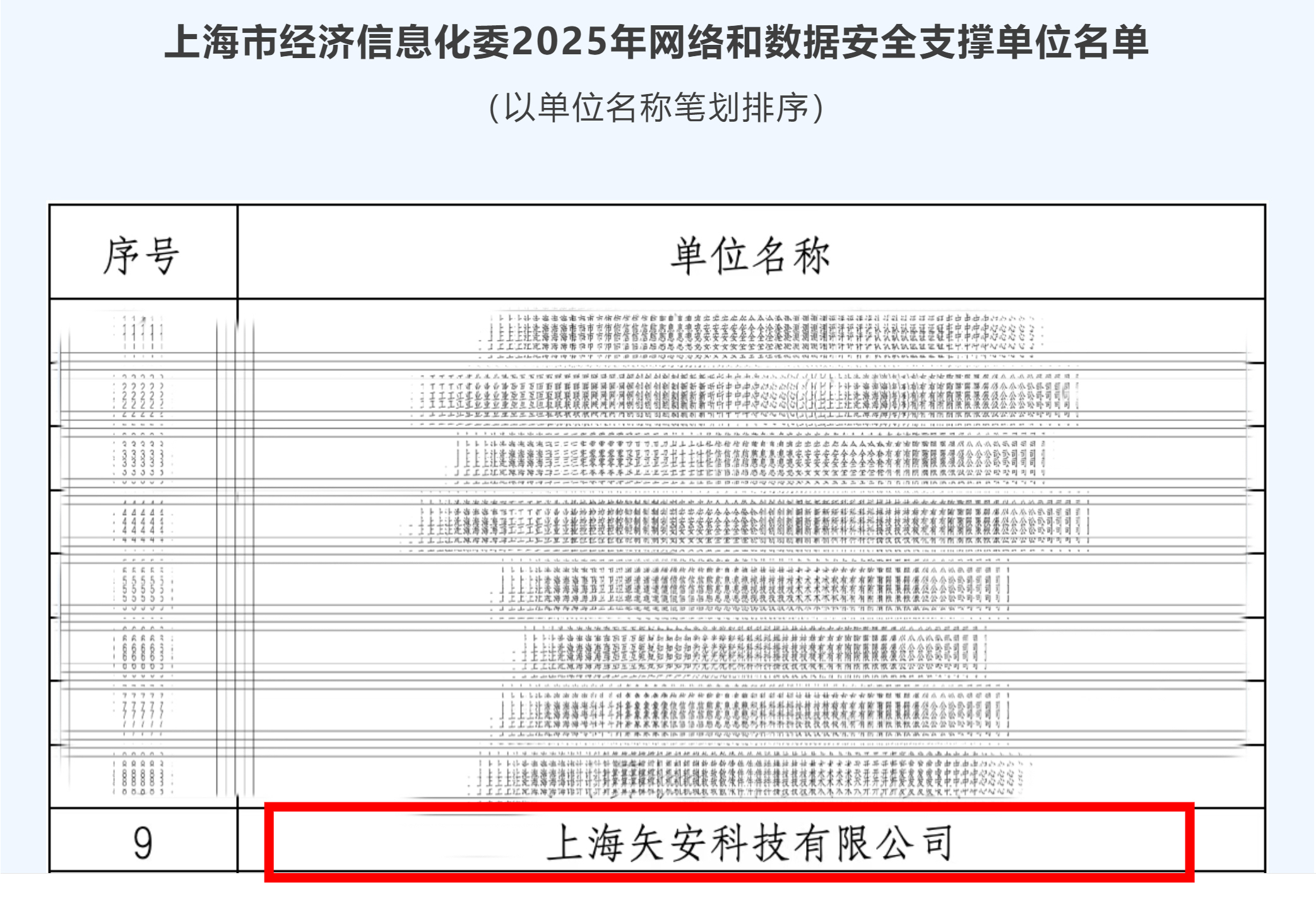 近日,上海市经济和信息化委员会正式公示了2025年网络和数据安全支撑单位名单,经过严格的自主申报、资料审查及专家评审等环节,矢安科技凭借卓越的技术实力和行业影响力成功入选。