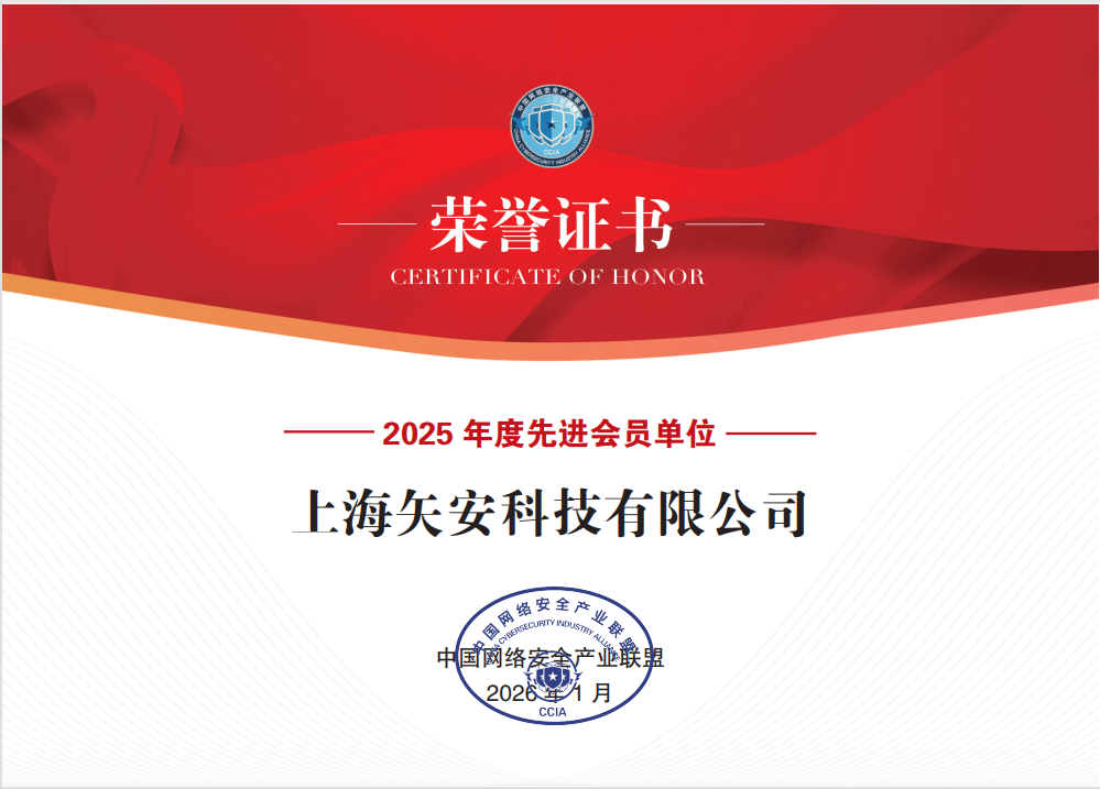 中国网络安全产业联盟(CCIA)成立于2015年,由中央网信办网络安全协调局指导,是中国网络安全领域具有广泛影响力的全国性行业组织。联盟始终致力于聚合产业资源,构建良好生态,提升网络安全技术服务水平,推动我国网络安全产业整体发展与国际化竞争能力提升。此次获评,不仅是联盟对于矢安科技过去一年工作的肯定,也体现了行业对矢安科技技术实力、责任担当与产业协同价值的高度认可。