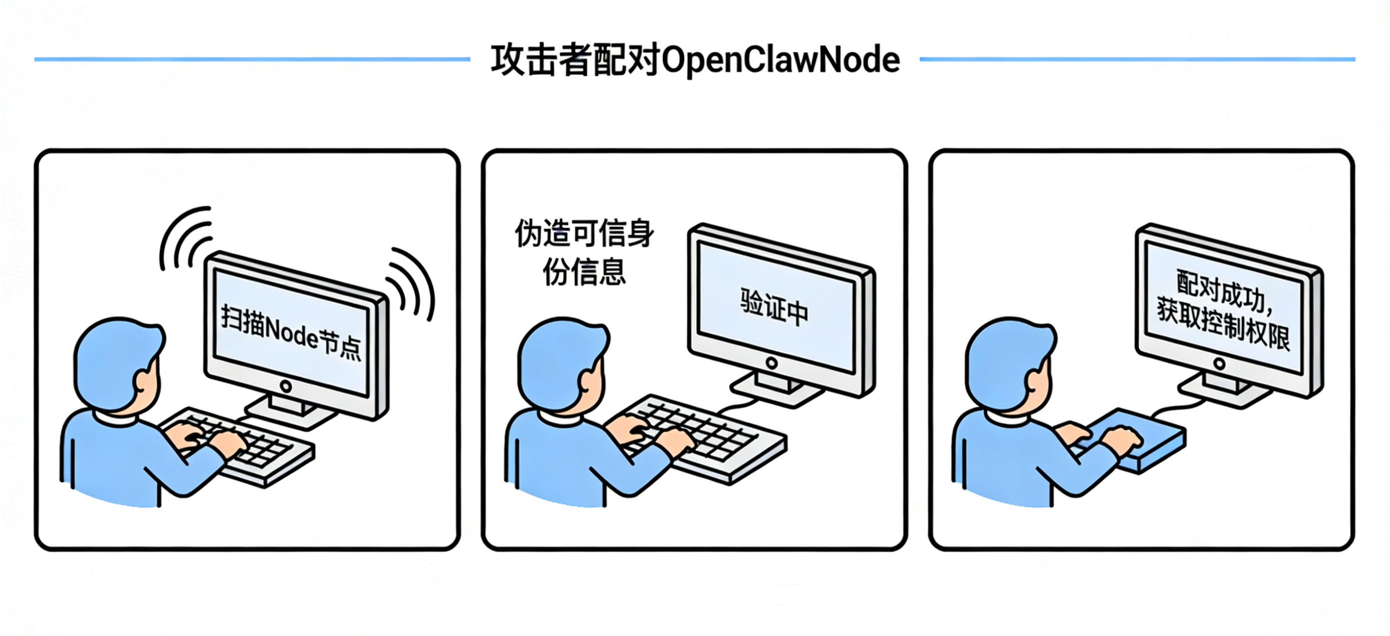 OpenClaw⽀持"Node"机制——让⼿机、其他电脑配对连接到⽹关。如果⽹关暴露在公⽹且认证较弱,攻击者可以: