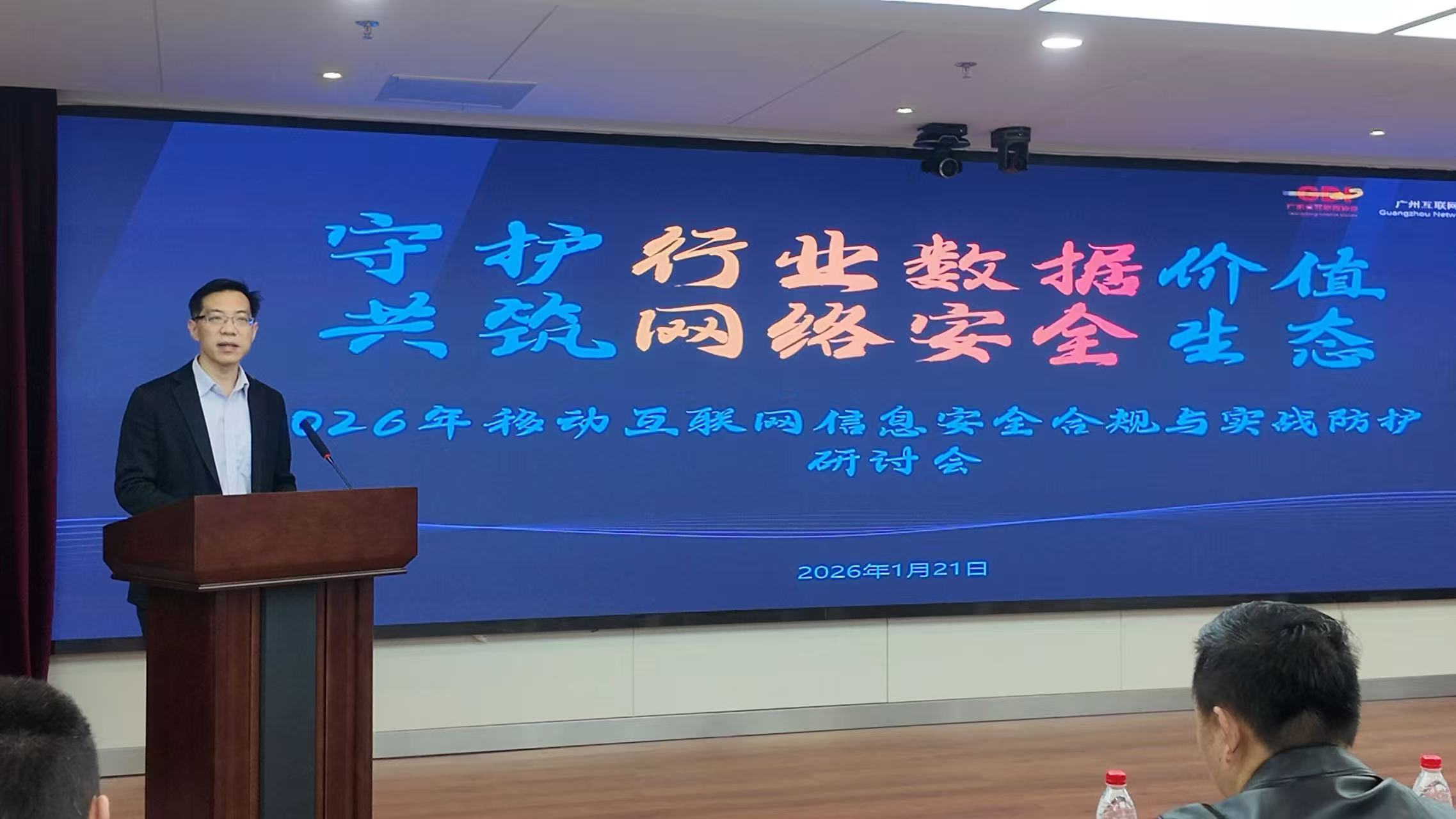 2026年1月21日上午,由广东省互联网协会联合工业和信息化部广州互联网交换中心共同主办的 “2026年移动互联网信息安全合规与实战防护研讨会暨‘互联网发展荟’成立仪式” 在广州成功举办。本次会议聚焦移动互联网信息安全合规与实战防护,旨在搭建行业深度交流平台,推动安全技术协同创新。